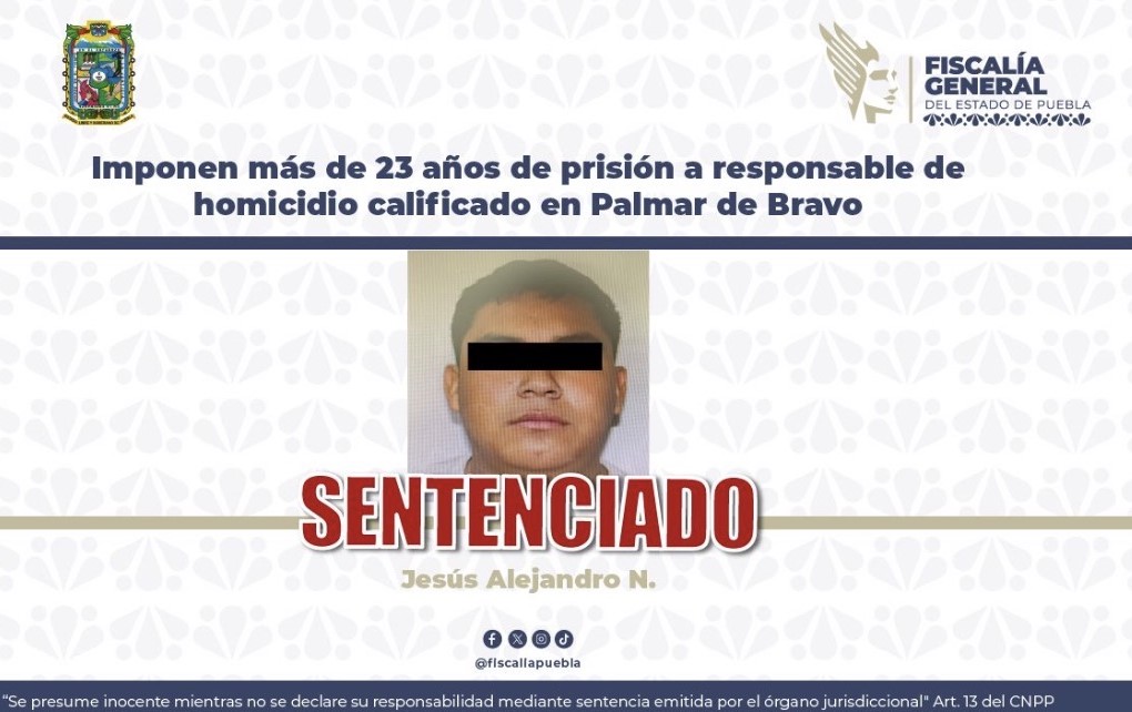 Como resultado del desahogo del juicio oral, la Fiscalía General del Estado de Puebla (FGE) obtuvo sentencia condenatoria contra Jesús Alejandro N., de 20 años, por su responsabilidad en el delito de homicidio calificado, acción acontecida en el municipio de Palmar de Bravo.