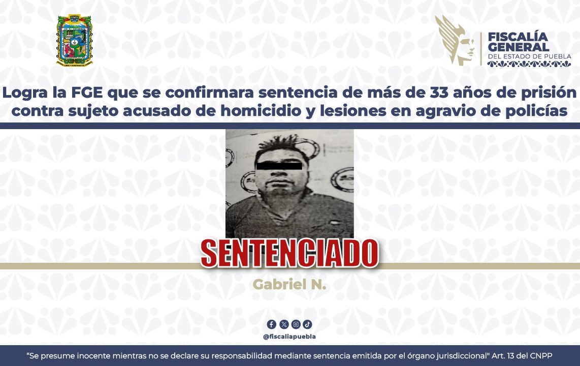 LOGRA LA FGE QUE SE CONFIRMARA SENTENCIA DE MÁS DE 33 AÑOS DE PRISIÓN CONTRA SUJETO ACUSADO DE HOMICIDIO Y LESIONES EN AGRAVIO DE POLICÍAS MUNICIPALES DE PUEBLA