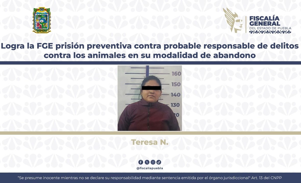 La Fiscalía General del Estado, mediante la exposición de argumentos, logró que la autoridad judicial impusiera la medida cautelar de prisión preventiva a Teresa N., como probable responsable de delitos contra los animales en su modalidad de abandono.