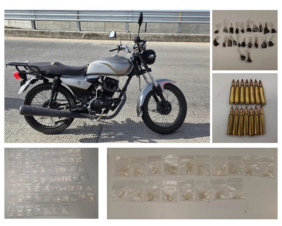 Con esta acción, las secretarías de Seguridad Pública y de Marina evitaron la distribución de 132 dosis de metanfetamina, cocaína, crack y heroína y aseguraron cartuchos útiles, dinero en efectivo, así como una motocicleta.