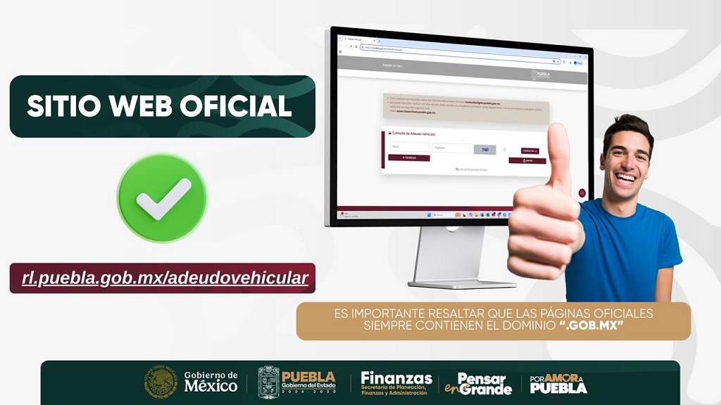 Los portales oficiales del Gobierno de México y del Gobierno del Estado de Puebla se distinguen por contar con el dominio “gob.mx”, por lo que se exhorta a la ciudadanía a evitar ingresar información personal, bancaria o vehicular en páginas con dominios comerciales u otros distintos, así como a desconfiar de enlaces compartidos por medios no oficiales.