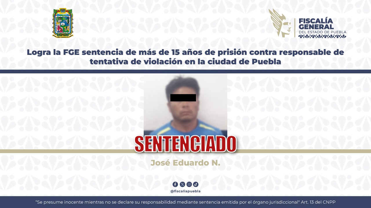 La Fiscalía General del Estado aportó diversas pruebas en contra de José Eduardo N., de 39 años de edad, logrando que la autoridad judicial le impusiera una sentencia de 15 años, 8 meses de prisión, como responsable del delito de violación agravada en grado de tentativa, en contra de una niña, ocurrido en la ciudad de Puebla.