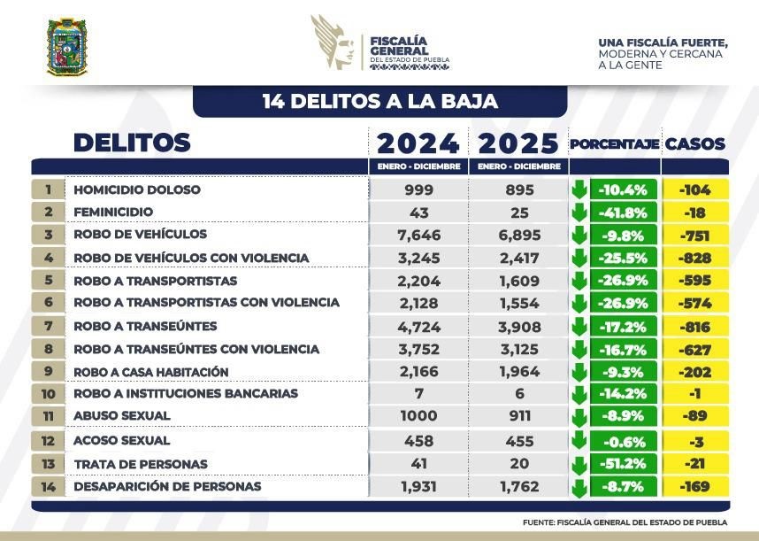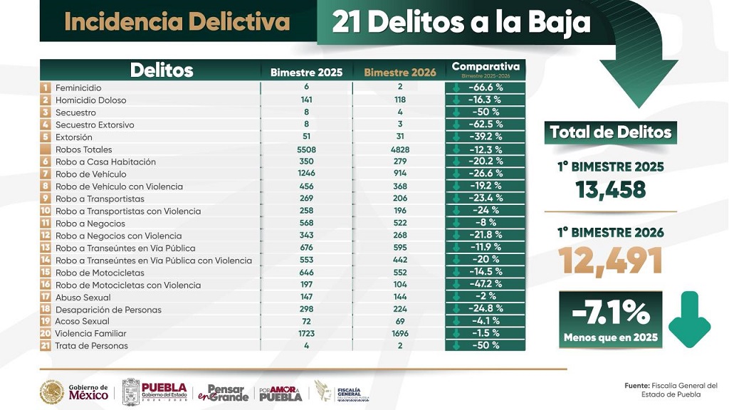 CIUDAD DE PUEBLA, Pue.- Durante el primer bimestre de 2026, la incidencia delictiva registró una disminución del siete por ciento en comparación con el mismo periodo de 2025, lo que se traduce en 21 delitos a la baja. "Tenemos la convicción plena, que nuestra responsabilidad coadyuvará con la seguridad, procurar la justicia y contribuir al desarrollo de la riqueza comunitaria", afirmó el gobernador de Puebla Alejandro Armenta Mier.