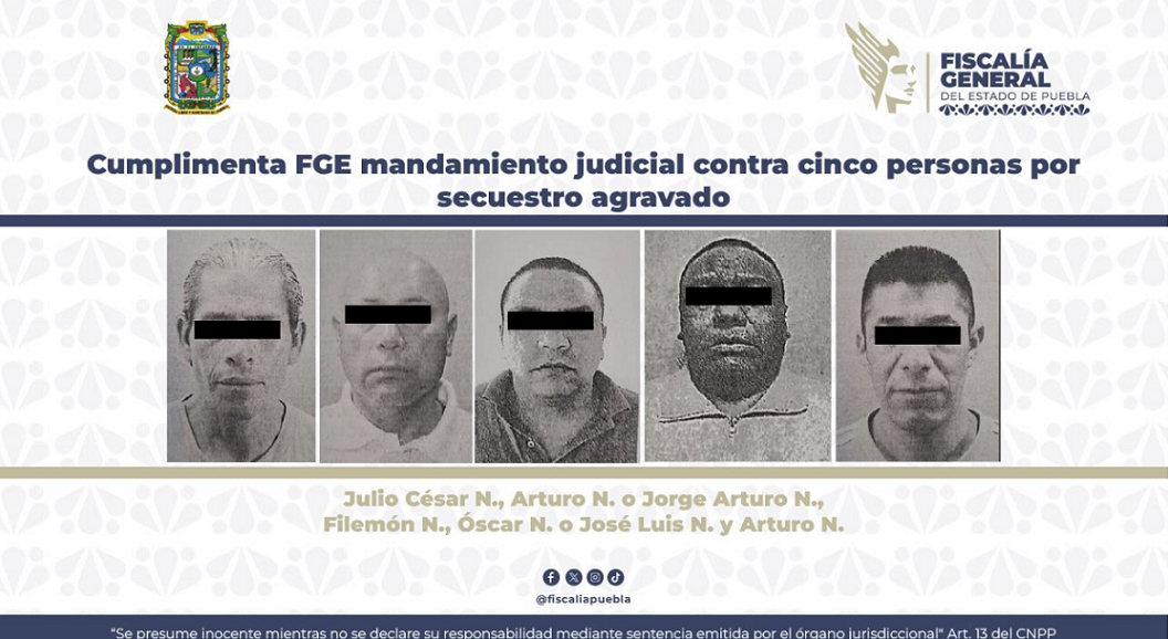 Como resultado del seguimiento a una investigación por secuestro, la Fiscalía General del Estado de Puebla (FGE) dio cumplimiento a órdenes de aprehensión por reclusión en contra de cinco hombres, como probables responsables de dicho delito.