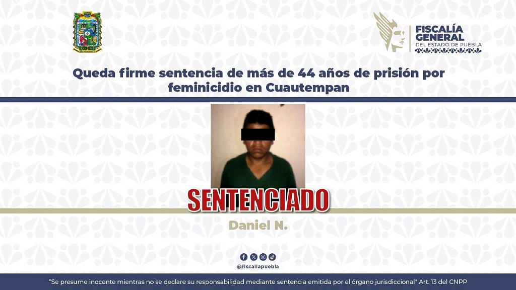 Como resultado del proceso penal, la Fiscalía General del Estado de Puebla (FGE) obtuvo la confirmación de la sentencia condenatoria en contra de Daniel N., responsable del delito de feminicidio, por hechos ocurridos en el municipio de Cuautempan.