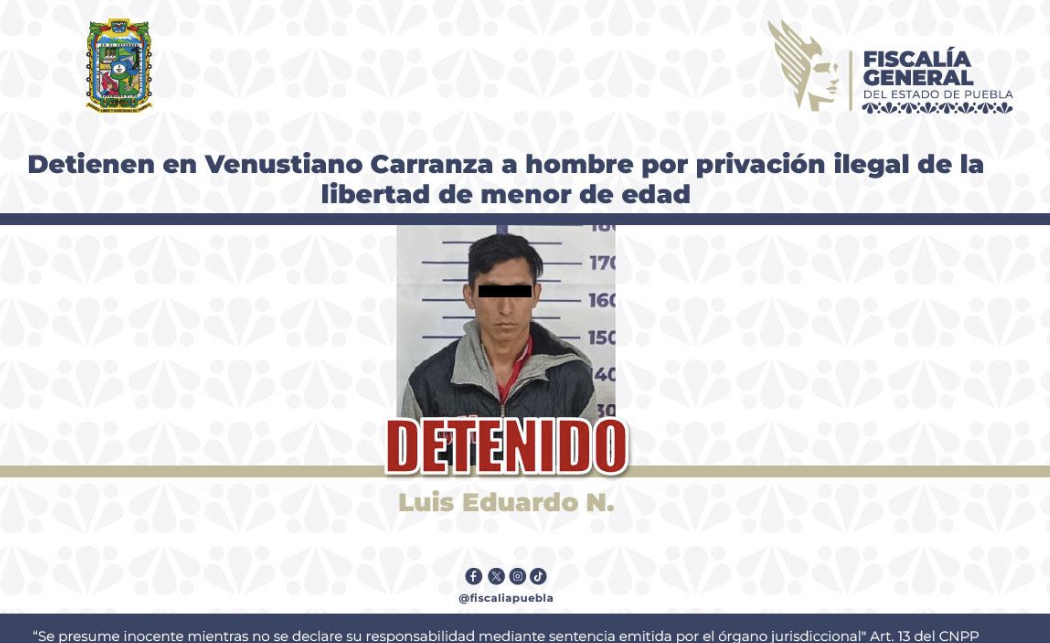 Como resultado de la intervención inmediata ante el reporte de familiares, la Fiscalía General del Estado de Puebla (FGE) detuvo en flagrancia a Luis Eduardo N., de 31 años, por su probable responsabilidad en el delito de privación ilegal de la libertad, en agravio de una adolescente.