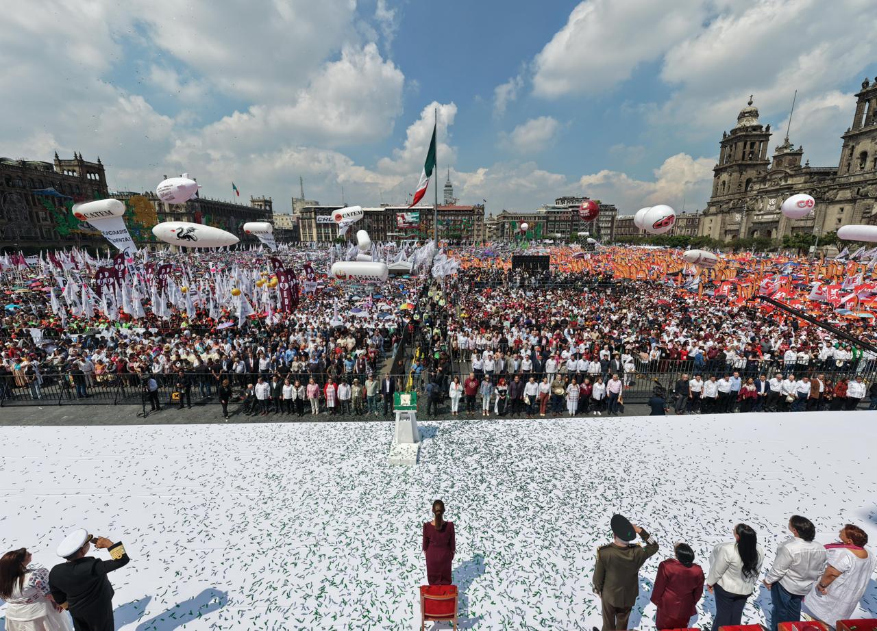 Ante miles de mexicanos y mexicanas, el evento marcó el cierre de su gira nacional de rendición de cuentas, en la que visitó los 31 estados del país, para dar a conocer el progreso del país y proyectos de su administración durante su primer año en el cargo, donde afirmó que el país transita por un camino de justicia social, dignidad y garantía de derechos sociales, libertad y soberanía. “El nuestro, es un gobierno del pueblo, por el pueblo y para el pueblo de México, vivimos un momento histórico”, aseguró la primera mujer presidenta de México.