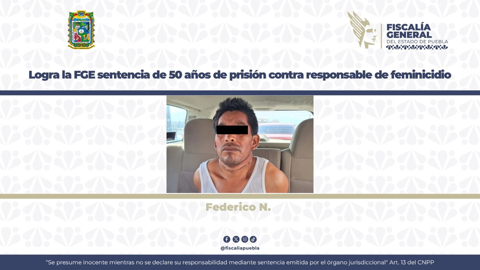La Fiscalía General del Estado, obtuvo una sentencia condenatoria de 50 años de prisión en contra de Federico N., de 53 años de edad, tras acreditar de manera plena su responsabilidad penal en la comisión del delito de feminicidio, cometido en el municipio de Zacatlán.