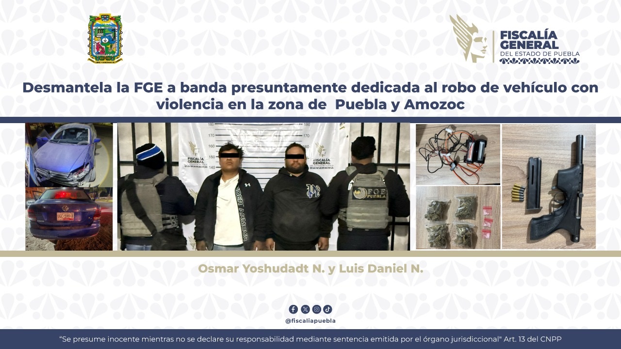 La Fiscalía General del Estado desarticuló mediante un operativo a una banda delictiva presuntamente dedicada al robo de vehículo con violencia en la zona limítrofe de los municipios de Puebla y Amozoc, operación en la que fueron asegurados Osmar Yoshudadt N. y Luis Daniel N. como probables integrantes.