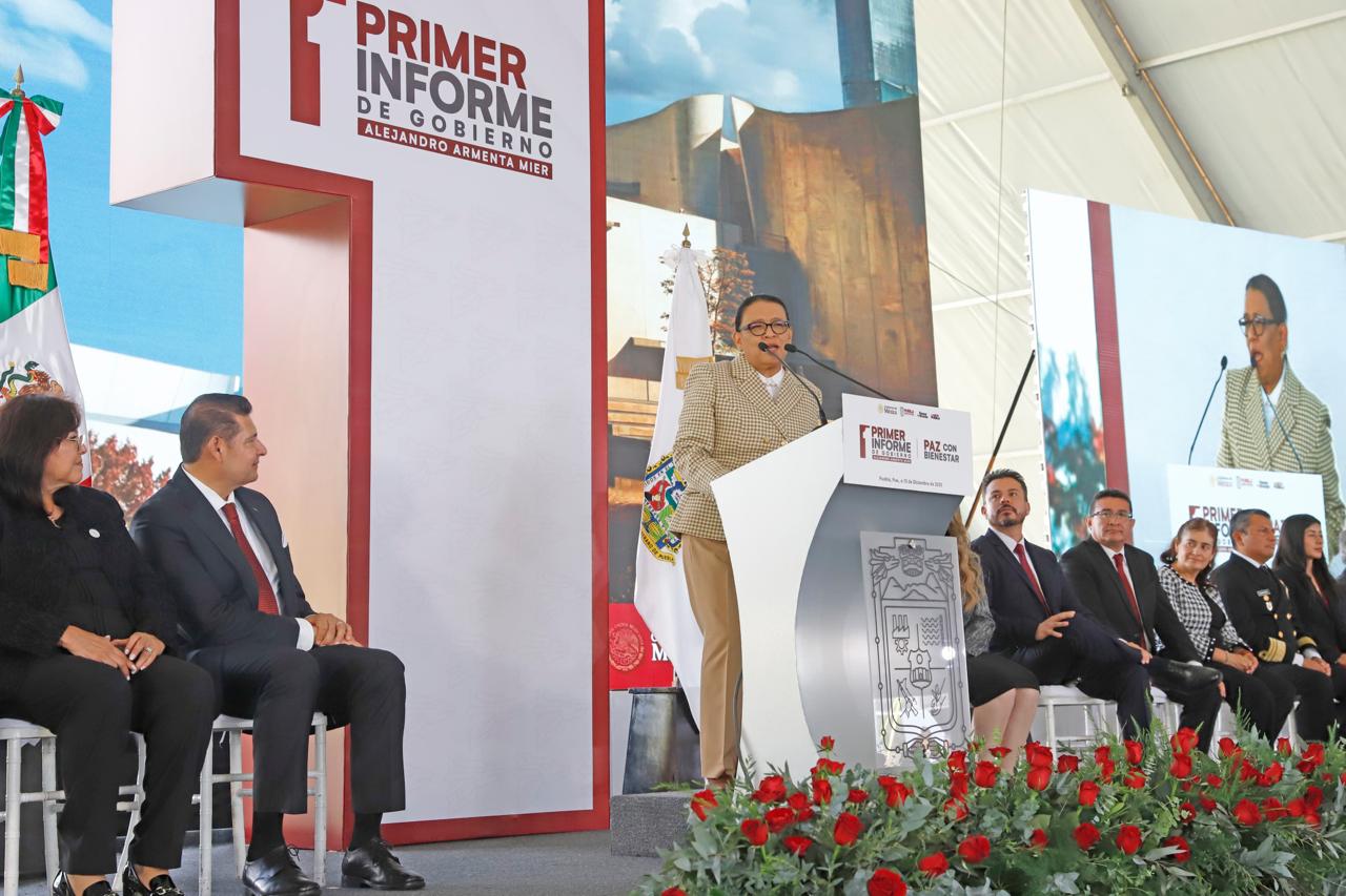 CIUDAD DE PUEBLA, Pue.- La secretaria de Gobernación federal, Rosa Icela Rodríguez, representante personal de la presidenta Claudia Sheinbaum, reconoció los resultados del primer año de gobierno estatal ya que la coordinación es permanente, pues la presidenta le tiene un genuino cariño a Puebla y a los poblanos, lo que los asistentes retribuyeron al corear: “¡Presidenta, presidenta!”.