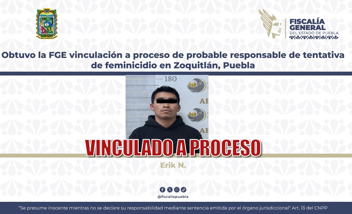 La Fiscalía General del Estado aportó diversos datos de prueba y obtuvo la vinculación a proceso de Erik N., por su probable responsabilidad en el delito de feminicidio en grado de tentativa en agravio de su pareja sentimental, ocurrido en el municipio de Zoquitlán, Puebla.