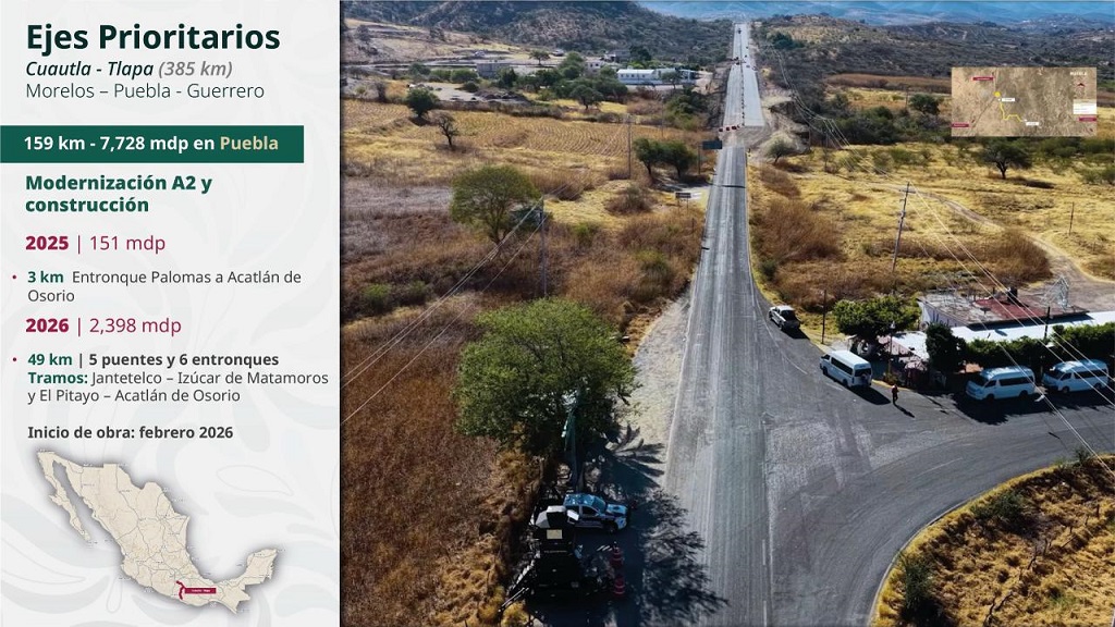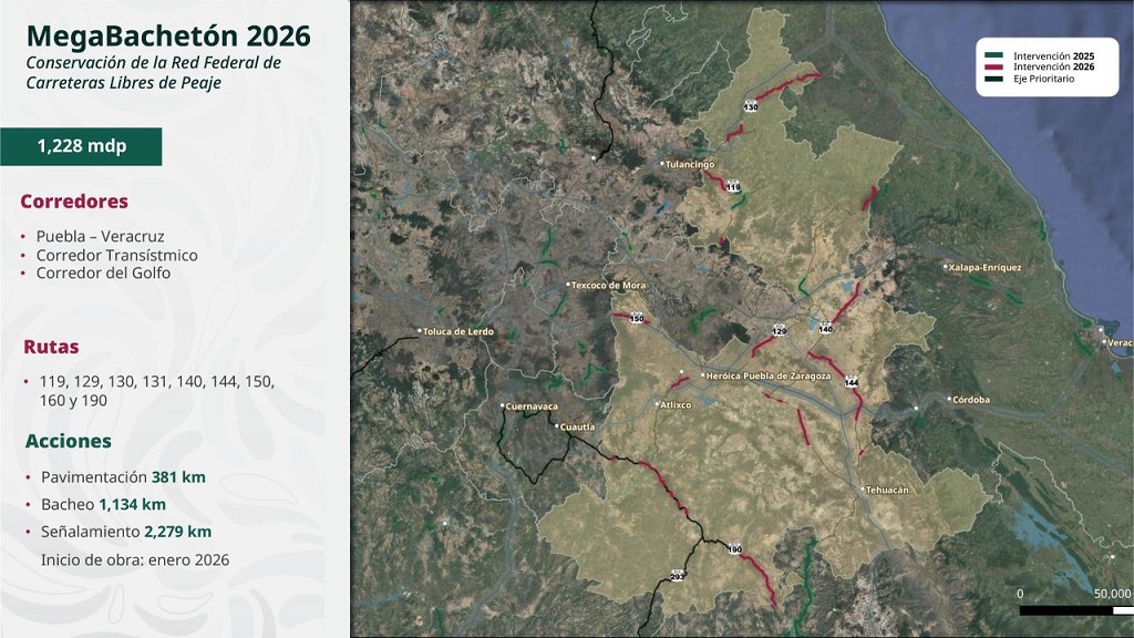 El secretario de Infraestructura, Comunicaciones y Transportes, Jesús Antonio Esteva Medina, explicó que el Gobierno Federal interviene la red federal y estatal de carreteras. En esta primera se ejecutan 25 acciones que abarcan tres kilómetros, mientras que en la segunda se realizan 53 acciones en 612 kilómetros, con trabajos de estabilización de taludes, obras de drenaje y construcción de muros de contención. Además, se atienden 22 puentes que suman dos kilómetros, mediante 12 rehabilitaciones, siete nuevas construcciones y ampliaciones. Las obras iniciarán en marzo.
