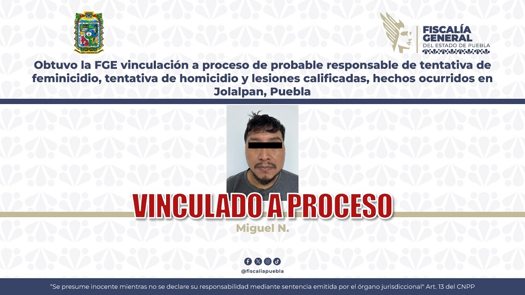 OBTUVO LA FGE VINCULACIÓN A PROCESO DE PROBABLE RESPONSABLE DE TENTATIVA DE FEMINICIDIO, TENTATIVA DE HOMICIDIO Y LESIONES CALIFICADAS, HECHOS OCURRIDOS EN JOLALPAN, PUEBLA
