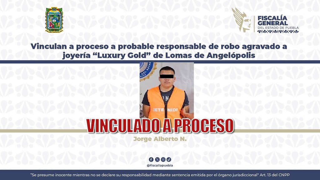 Como resultado de los actos de investigación, la Fiscalía General del Estado de Puebla (FGE) obtuvo la vinculación a proceso de Jorge Alberto N., de 25 años, por su probable responsabilidad en el delito de robo agravado, por hechos ocurridos en el municipio de San Andrés Cholula.