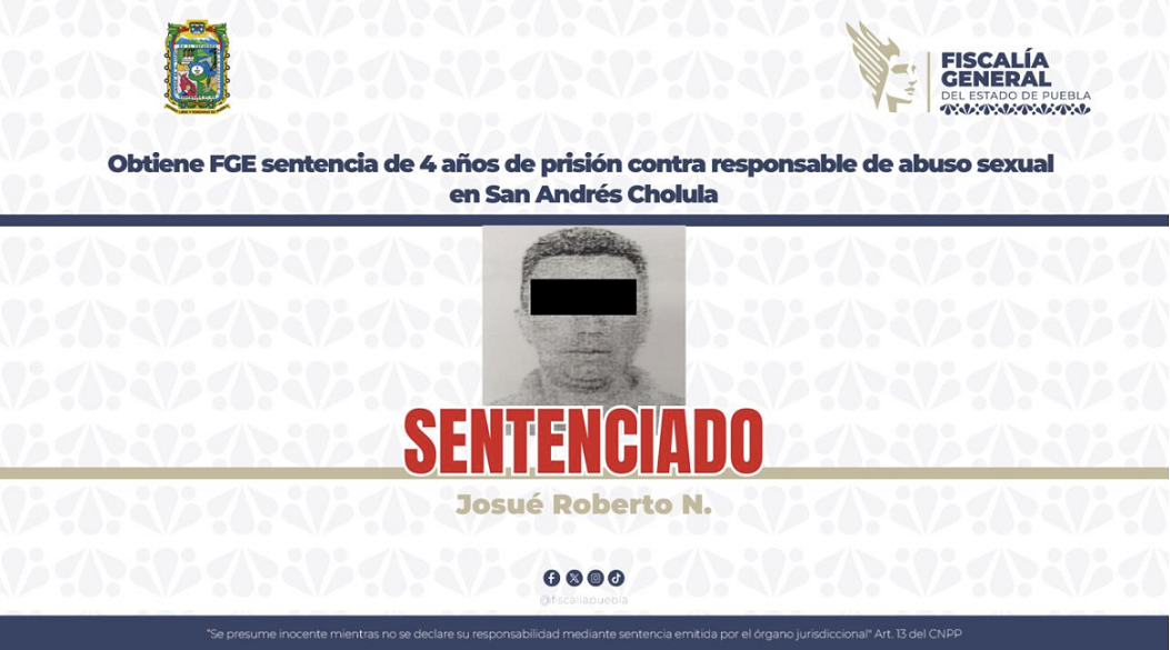 La Fiscalía General del Estado de Puebla informa que obtuvo sentencia condenatoria de 4 años de prisión en contra de Josué Roberto N., responsable del delito de abuso sexual cometido en agravio de una adolescente, en el municipio de San Andrés Cholula.